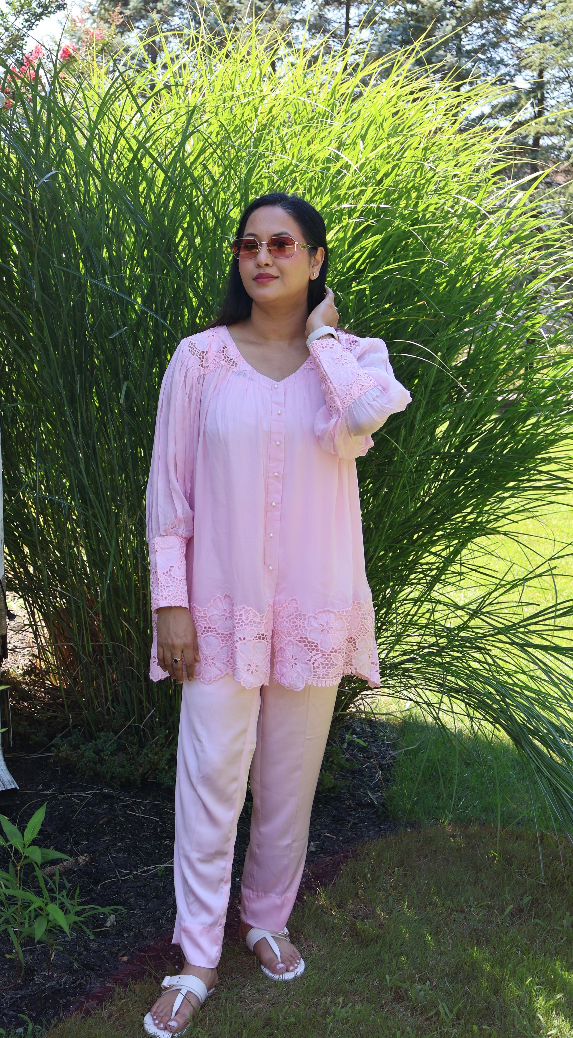 Stay chic and comfortable with this light pink cotton kurta featuring delicate lace detailing on the cuffs, hem, and shoulders. Designed with soft pleats and pearl button accents, this kurta blends modern elegance with traditional charm, making it a versatile choice for both casual outings and festive gatherings.