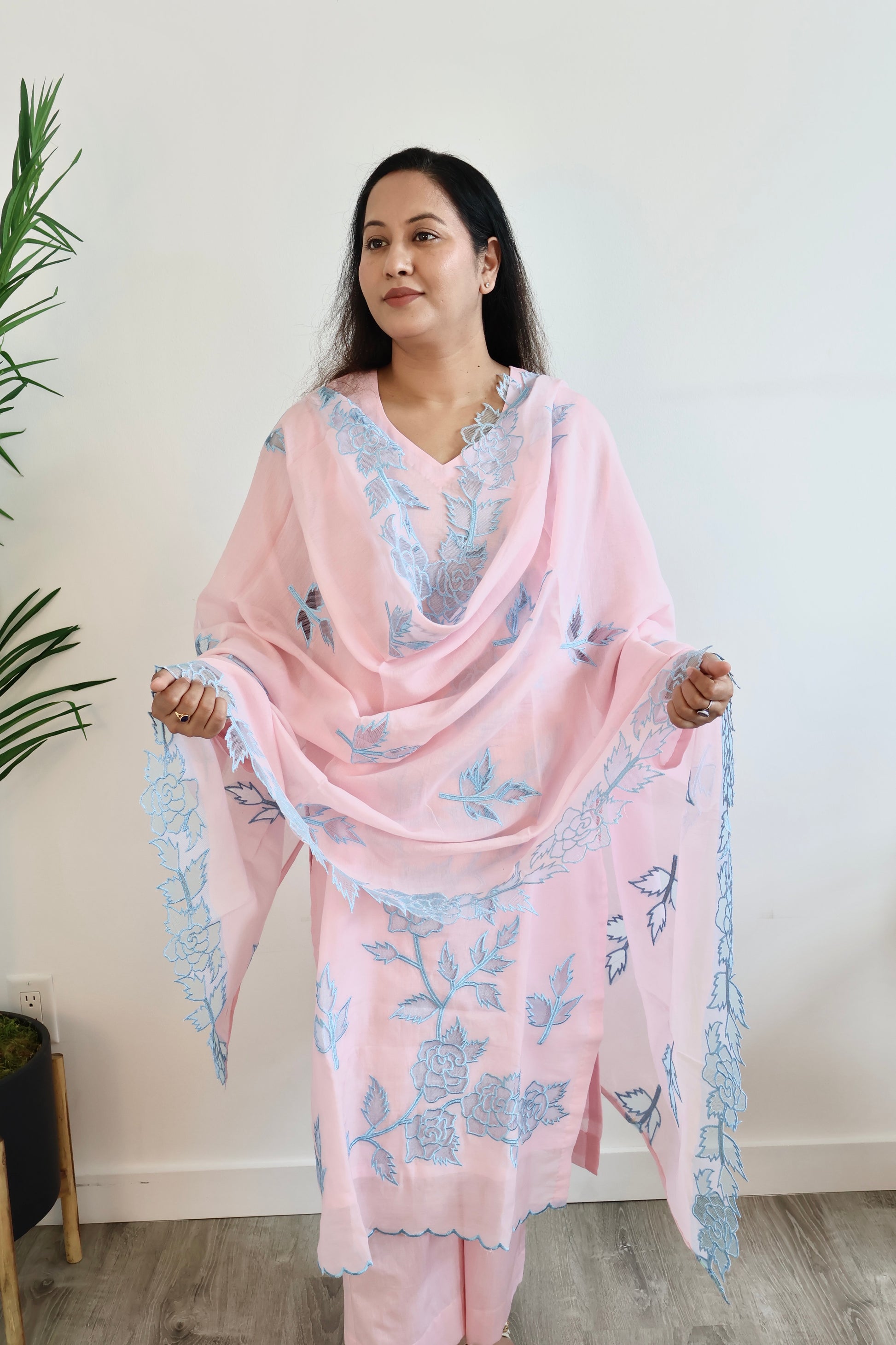 Pastel Pink Cotton Chikankari-Style Suit Set + Dupatta